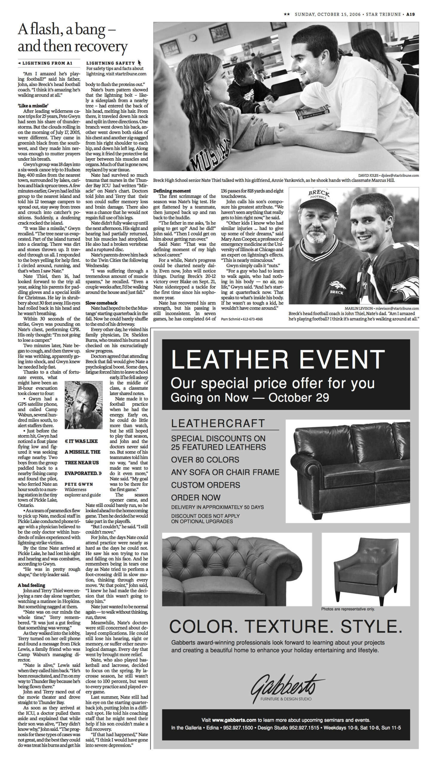 Nate Thiel remembers nothing of the green sky, the vaporized tree or the lightning bolt that entered the back of his head, exited his left ankle and threw him 30 feet into a pile of downed trees in the middle of the Canadian wilderness.